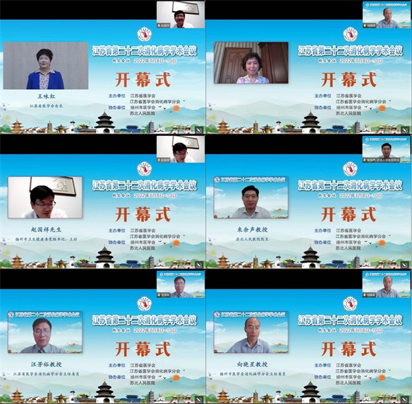 7月8~10日,由江苏省医学会、江苏省医学会消化病学分会主办,扬州市医学会、苏北人民医院协办的“江苏省第二十二次消化病学学术会议”在线举办。大会开幕式由江苏省医学会消化病学分会委员、苏北人民医院消化科主任向晓星教授主持,江苏省医学会消化病学分会主委、东部战区总医院消化科主任汪芳裕教授致,江苏省医学会会长王咏红,中华医学会消化病学分会候任主委、四川大学华西医院消化科主任唐承薇教授,扬州市卫健委党组书记、主任赵国祥,苏北人民医院院长束余声教授等先后致辞。