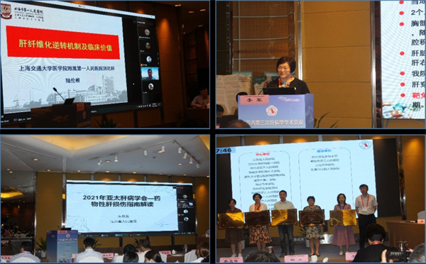 主题报告环节,中华医学会肝病学分会主任委员徐小元教授、候任主任委员南月敏教授,和中华医学会内科学分会主任委员韩英教授分别对“胆汁淤积性肝病管理指南(2021)”“原发性肝癌三级预防共识”和“2021年原发性硬化性胆管炎指南”进行了解读。来自美国加州大学洛杉矶分校的Bibo Ke教授讲解了非酒精性脂肪肝的免疫机制以及可能的治疗靶点。上海市医学会肝病学分会主任委员陆伦根教授带来了“肝纤维化逆转机制及临床价值的探索”专题报告,江苏省医学会肝病学分会主任委员李军教授通过临床病例讲解了肝癌的靶免治疗不良反应的诊断和治疗,南京医科大学第一附属医院的朱传龙教授进行了2021年亚太肝病学会-药物性肝损伤指南解读。会上还举行了江苏省脂肪肝规范诊疗协助单位授牌仪式。