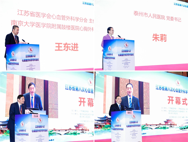 大会开幕式由江苏省医学会心血管外科学分会候任主任委员、江苏省人民医院心脏大血管外科主任邵永丰教授主持,江苏省医学会心血管外科学分会主任委员、南京鼓楼医院心胸外科主任王东进教授,泰州市人民医院党委书记朱莉教授,泰州市卫生健康委员会党组书记、主任江义舟,江苏省医学会常务副会长陈亦江教授先后致辞。