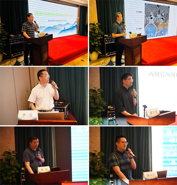 在学术交流环节,南京脑科医院张岩松教授、苏州市立医院吴建东教授分别汇报了1例复杂岩斜区脑膜瘤、1例小脑巨大血管母细胞瘤的显微手术治疗和鞍区肿瘤的手术治疗体会。无锡第二人民医院李兵教授汇报了蝶骨嵴脑膜瘤的手术切除案例,强调不同的分型、对周围血管评估、回流静脉保护、周围神经的保护是手术的重点。南京鼓楼医院戴宇翔教授汇报了2例脑干血管母细胞瘤的手术治疗案例,总结了肿瘤的分类、临床表现、手术适应证、手术步骤和术后注意事项。镇江市第一人民医院陈波教授汇报了4例听神经瘤的手术治疗案例,总结了合适的手术体位、开颅暴露和切除过程,强调了术中电生理监测,面神经、后组颅神经、脑干面和岩静脉的保护是手术重点。南京鼓楼医院陆天宇教授汇报了29例听神经瘤的手术切除情况统计,总结了听神经瘤的分级和分期对手术切除的指导意义。
