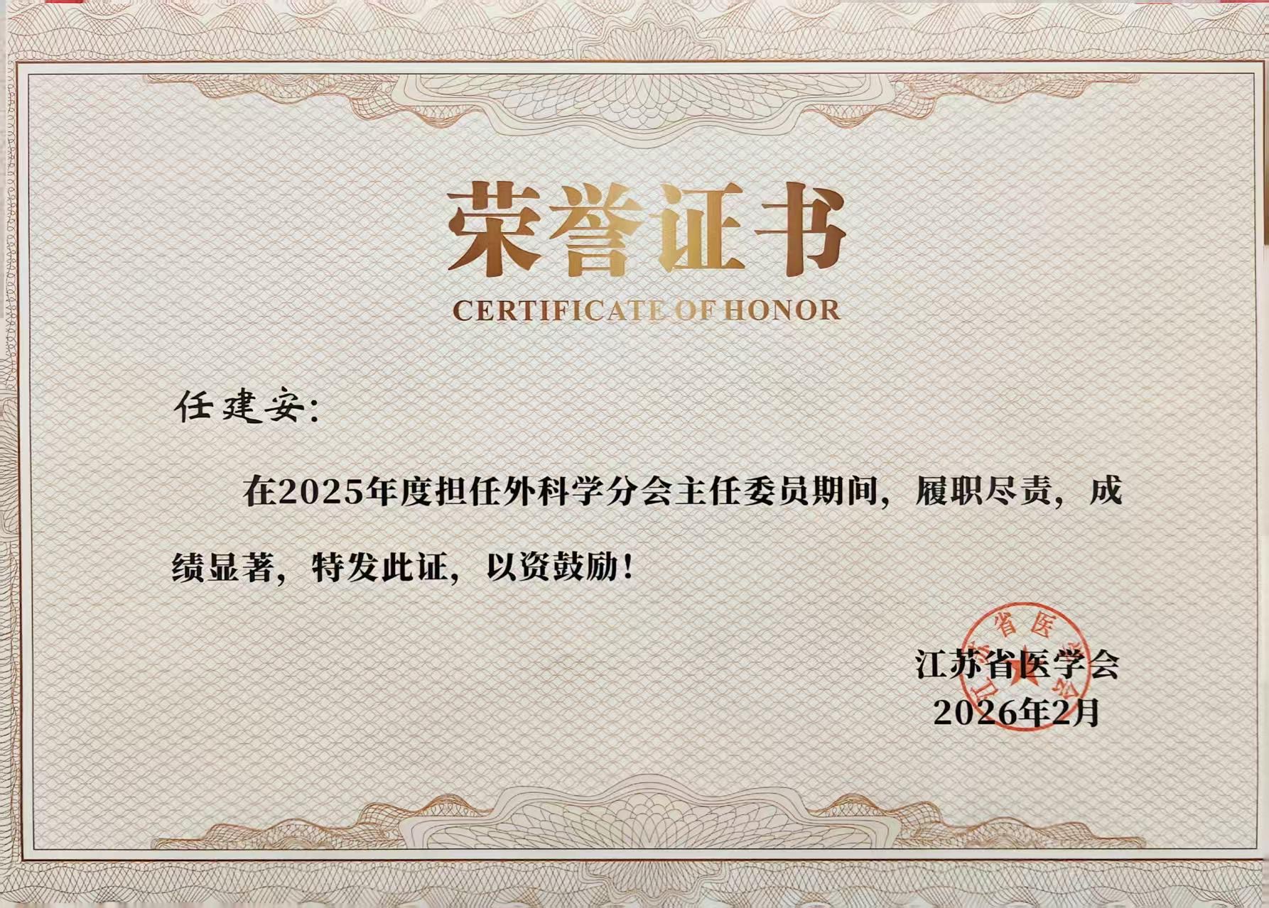 2026年2月7日,江苏省医学会2026年工作会议在南京召开。 江苏省医学会外科学分会荣获“2025年度优秀专科分会”,由江苏省医学会外科学主办的“第二十一次外科学学术会议”荣获“2025年度优秀学术会议”,分会主委任建安教授荣获“2025年度优秀主任委员”。会上,任建安主委受邀分享外科学分会工作经验。 这是外科学分会继上年度后再次荣获三大奖项,连续两年取得“大满贯”。