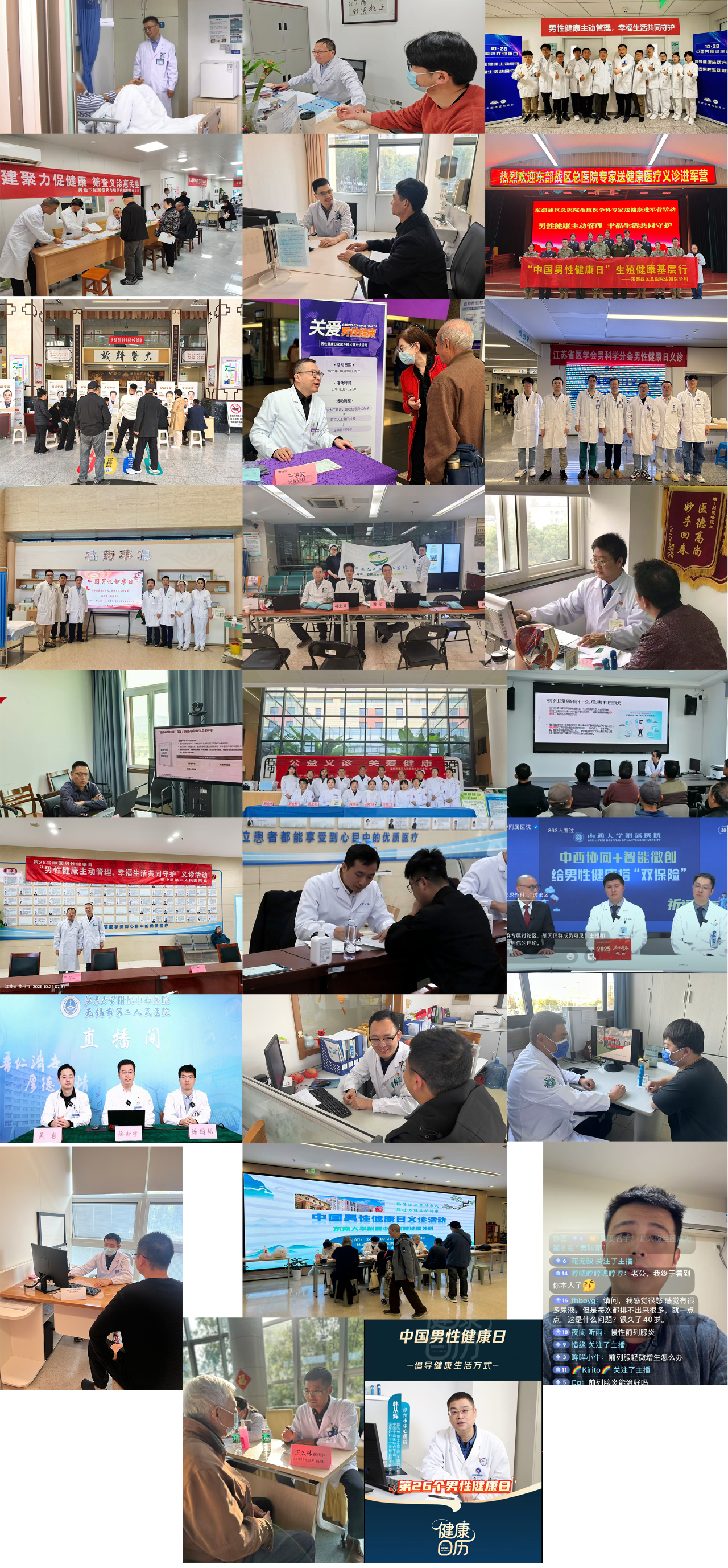 为迎接2025年“男性健康日”,在中华医学会男科学分会主任委员商学军教授、江苏省医学会男科分会现任主任委员宋宁宏教授、候任主任委员李杰教授的推动下,来自江苏省内众多知名医院的泌尿男科团队积极投身于一系列全国男性健康日公益活动。活动形式丰富多样,涵盖义诊、科普等。江苏泌尿男科专家们以饱满的热情、专业的技术,为每一位患者提供优质的医疗服务和通俗实用的科普宣传。覆盖了包括前列腺疾病、早泄、无精子症、勃起功能障碍、