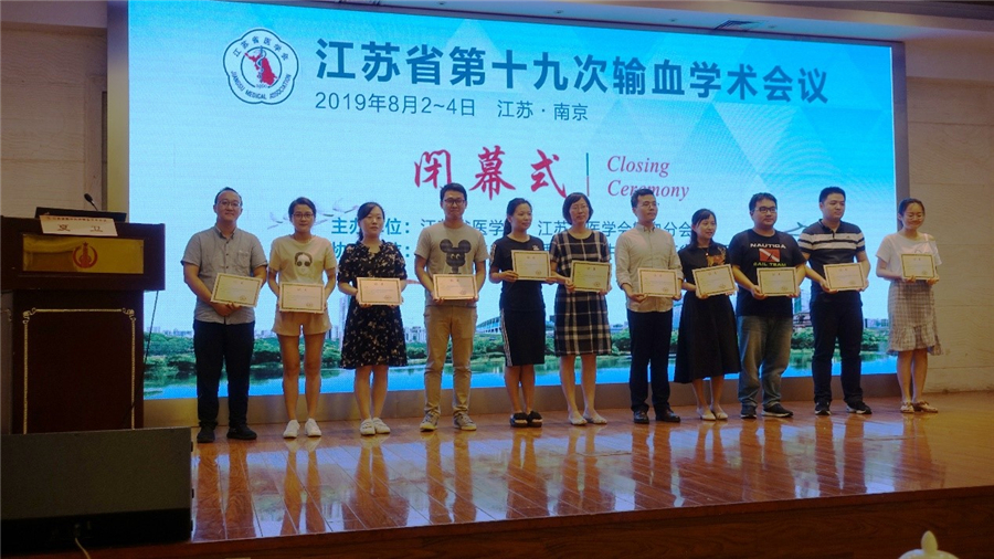 此外,为进一步深化学术交流,分享工作心得,本次会议还安排了征文活动,共收到会议征文75篇,经专家评审选出11篇优秀论文进行现场探讨交流。江苏省医学会输血分会现任主任委员周小玉和侯任主任委员黄成垠为获奖论文颁发优秀论文奖,副主任委员夏卫为大会闭幕式致辞。