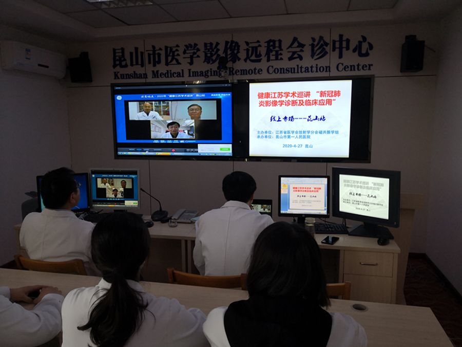2020年4月27日下午,由我会放射学分会磁共振学组主办,昆山市第一人民医院放射科承办的新冠肺炎影像学诊断及临床应用”线上专场活动(昆山站),在昆山市第一人民医院医学影像远程会诊中心举办。昆山市第一人民医院放射科王建良主任主持本次巡讲活动,我会放射学分会磁共振学组组长、苏州大学附属第二医院影像诊断科沈钧康主任参会。
