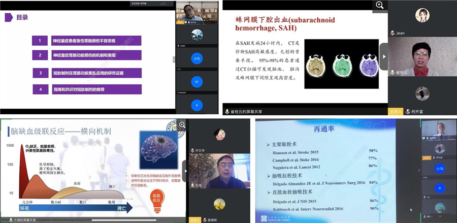 本场线上活动主要围绕脑卒中治疗、脑保护研究进展及重症患者营养支持等内容展开。专家讲课环节中,我会脑卒中分会主任委员柯开富教授,副主任委员崔桂云教授,委员施海彬教授和苏州大学附属第一医院方琪副院长分别就“神经重症患者胃肠功能损伤的营养支持治疗”“假性蛛网膜下腔出血”“急性缺血性脑卒中血管内治疗技术进展”和“脑保护剂的研究进展”专题进行线上授课。课后,几位讲者对学员的线上提问进行答疑解惑,并与学员共同讨论分享了脑卒中规范化诊疗管理经验。