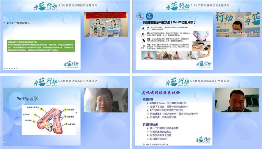 来自江苏省人民医院呼吸与危重症医学科、心血管内科,南京鼓楼医院风湿免疫科的几位专家进行了线上讲座。江苏省人民医院张海峰主任医师讲解了“肺动脉高压的危险分层与达标治疗”,金宇副主任医师阐述了“肺动脉高压的随访与病情评估”,陈雪松副主任医师介绍了“肺动脉高压的药物治疗”,南京鼓楼医院姜波主任医师分享了“结缔组织性肺动脉高压的诊治”。通过在线答疑环节,几位专家详细解答了部分肺动脉高压患者和家属提出的问题。