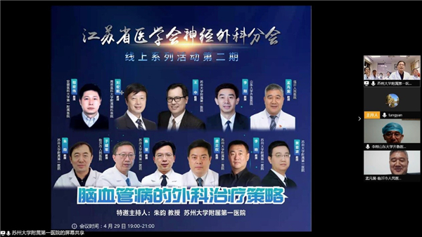 2020年4月29日,由江苏省医学会神经外科分会举办,苏州大学附属第一医院承办的线上活动第二期——脑血管病的外科治疗策略”如期举行,本次活动由苏州大学附属第一医院朱昀教授主持,苏州大学附属第一医院王中教授担任大会主席。