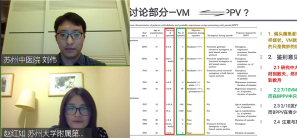 在会议讨论环节,苏州市中医医院的刘伟主任和江苏省人民医院的燕兰云博士筛选提供了具有疑难表现、典型表型的病例进行讨论学习。刘伟主任通过病例分享提到VM位置性眩晕高发,位置性眩晕不等同于耳石症,位置性眩晕及偏头痛样的表现更接近于VM而不是BPPV。燕兰云博士介绍了PFO和偏头痛的联系,指出先兆性偏头痛与PFO关系更为密切,PFO封堵术在一定程度上可以缓解先兆症状和头痛症状;对于先兆性偏头痛患者,应做好相应的筛查。