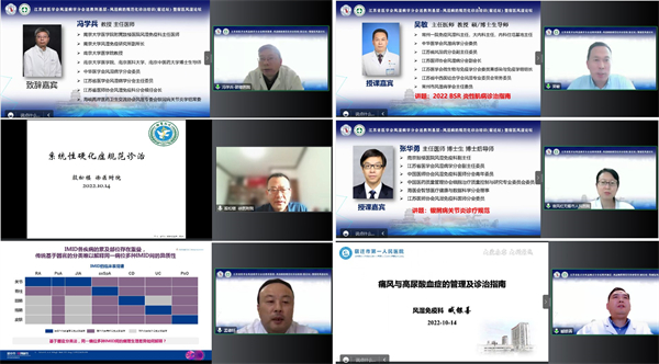 会议邀请了常州市第一人民医院吴敏教授、徐州医科大学附属医院殷松楼教授、南京鼓楼医院张华勇教授、东南大学附属中大医院徐晓龑教授、南京鼓楼医院集团宿迁医院副院长牛磊教授、淮安市第一人民医院孟德钎教授、宿迁市第一人民医院臧银善教授等分别作“2022BSR炎性肌病诊治指南”“系统性硬化症诊疗进展”“银屑病关节炎诊疗规范”“结缔组织病合并间质性肺病诊疗进展”“强直性脊柱炎影像学评估”“从细胞因子角度重新认识axSpA”和“痛风与高尿酸血症的管理及诊治指南”等报告,内容丰富,贴近临床实际。报告结束后,与会专家和代表们围绕风湿类疾病诊疗流程规范与学科进展进行了交流讨论,气氛热烈。