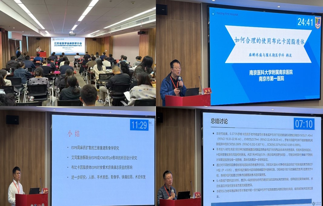 学术交流环节内容翔实、视角多元,聚焦临床实践,深入探讨了前沿技术与科研进展。与会专家旁征博引,结合最新研究成果与临床经验,进行了精彩纷呈的讲解。嵇富海教授围绕胸科手术患者的术后疼痛管理这一热点问题展开授课,指出神经阻滞技术与长效局麻药物的进步,显著改善了胸科手术患者的预后。江苏大学附属医院的蒋鹏教授系统讲授了“超声引导下前路髂腰肌间隙阻滞”技术。研究证实,该技术对老年髋部骨折患者术前镇痛安全有效,有助于提升术后恢复质量,契合老龄化社会的医疗需求,也为麻醉医师早期介入临床提供了新思路。徐州医科大学的赵林林教授详细解析了TAPB与QLB阻滞的临床应用;南京市第一医院的韩流教授则就布比卡因脂质体的合理使用提出专业建议,助力学员在降低风险的同时,最大化药物疗效。学组组长彭科教授以“镇痛与区域阻滞的临床研究设计”为题,结合三项临床研究案例,从选题创新、研究设计、多学科协作等角度进行系统阐述。其讲解高屋建瓴又紧贴临床,引发了学员的广泛共鸣。