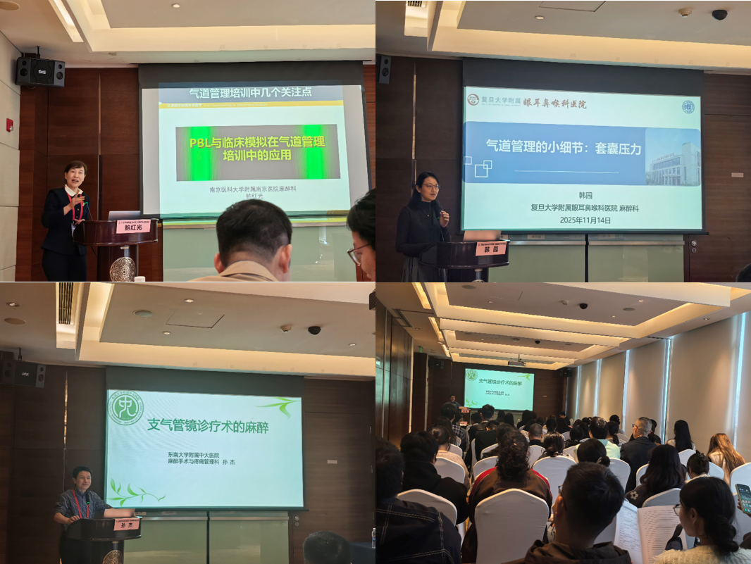 会议第二项议程为专题授课环节,由鲍红光教授、韩园副教授及孙杰教授依 次展开精彩分享。鲍红光教授(气道管理学组名誉组长、顾问)以《PBL 与临床 模拟在气道管理培训中的应用》为题,创新性地将真实病例融入临床模拟场景, 构建“认知-实践-反思 ”的闭环学习体系,系统性提升学员的临床决策能力,尤其在紧急危机情境下的应变能力。韩园副教授(复旦大学附属眼耳鼻喉科医院麻醉科副主任)聚焦《气道管理的小细节:套囊压力》,深入剖析人工气道护理中 的关键环节,强调“细节决定成败 ”,其授课内容对降低气道黏膜损伤风险、保障气道密闭性具有重要指导意义。孙杰教授(学组组长)压轴登场,以《支气管镜诊疗术的麻醉》为题,精准阐释麻醉技术与临床需求的深度融合,指出其对于提升患者舒适度、保障诊疗安全、提高检查成功率及优化多学科协作的深远价值。会场座无虚席,学员凝神倾听,互动积极,学习热情高涨,彰显了基层麻醉医生 对提升专业能力的迫切需求。